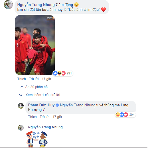 Nguyễn Trang Nhung - bạn gái của tiền vệ ĐTVN Văn Toàn lập tức có mặt. Cô bình luận : “Cảm động. Em xin đặt tên bức ảnh này là “Đất lành chim đậu” “, kèm bức ảnh CP10 cõng Văn Toàn.