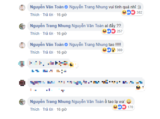Nhanh chóng sau đó, “nhân vật chính” Văn Toàn xuất hiện với bình luận: ” Vui tình quá nhỉ Nguyễn Trang Nhung”. Cô bạn gái ngay lập tức đáp lại: “Ai đấy Nguyễn Văn Toàn “.