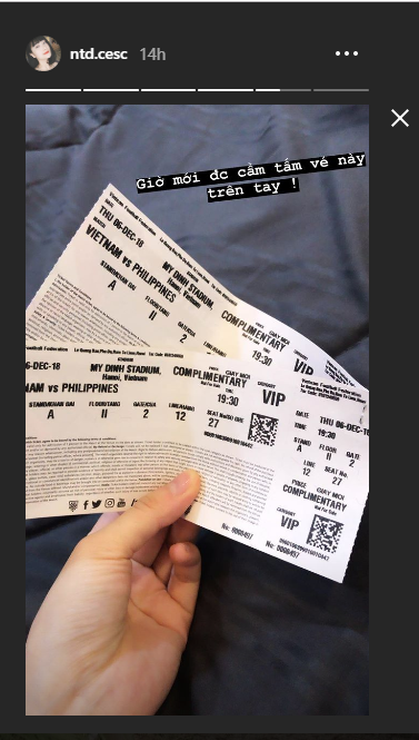 Không kém cạnh bạn gái Tiến Linh, cô bồ xinh đẹp của “tiền vệ đá sân nhỏ 9 điểm” Huy Hùng cũng kịp “khoe” với mọi người trên story instagram cặp vé trên SVĐ Mỹ Đình.