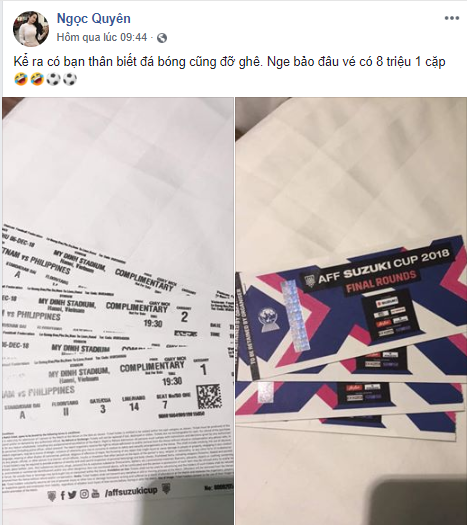 Thế nhưng, cô bạn gái nóng bỏng của “vua dội bom” lại hớn hở đăng “khoe” trên trang cá nhân: “Kể ra có bạn thân biết đá bóng cũng đỡ ghê. Nghe bảo đâu vé có 8 triệu cặp”.