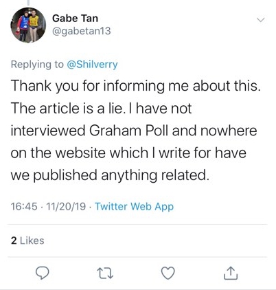 Tuy vậy, thông tin về việc BTV Grabriel Tan phỏng vấn cựu trọng tài NHA - Graham Poll là hoàn toàn sai sự thật. Theo lời Gabriel, anh đang trong chuyến du lịch Nhật Bản và không hề có bài phỏng vấn nào với vị trọng tài này.