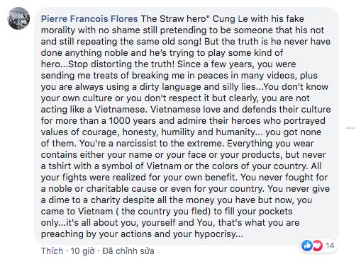 “Anh hùng rơm” đó là từ đầu tiên Flores nói về Cung Lê thông qua một lời bình luận trên trang cá nhân. Tiếp đó võ sư Canada cho rằng tay đấm người Mỹ lại đào bới chuyện cũ và chỉ muốn về Việt Nam với mục đích duy nhất là kiếm tiền, chứ không có mục tiêu cao cả như bài phát biểu với truyền thông trước đó.