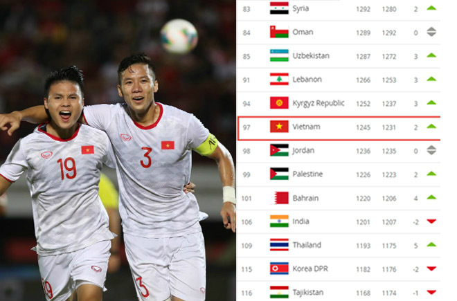 Theo bản tin thể thao hôm nay thứ 6 ngày 25/10/2019, ĐT Việt Nam với 2 chiến thắng trước Malaysia (1-0), Indonesia (3-1) được cộng 14 điểm (từ 1231 lên 1245), tăng 2 bậc và trở lại hạng 97 FIFA, 15 châu Á. Hồi tháng 9, thầy trò HLV Park Hang Seo từng bị trừ 1 điểm sau trận hòa Thái Lan 0-0 và rớt xuống hạng 99.