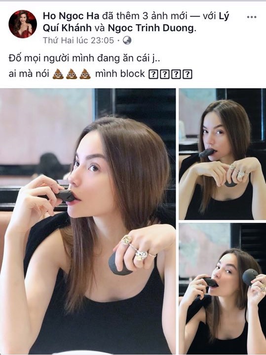 Hôm thứ 2, Hồ Ngọc Hà bất ngờ đăng trên mạng xã hội một loại bánh màu đen và đưa cặp môi mềm mại cắn đầy gợi cảm. Cô ca sỹ nổi tiếng này kèm theo dòng trạng thái thách thức các fan: “Đố mọi người mình đang ăn cái gì?”.
