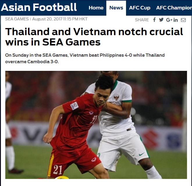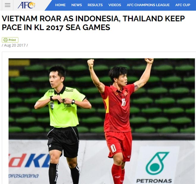 Trang chủ Liên đoàn bóng đá châu Á (AFC) giật tít: “U22 Việt Nam gầm thét cũng như U22 Indonesia và U22 Thái Lan duy trì vị thế tranh vé váo bán kết SEA Games 2017”.