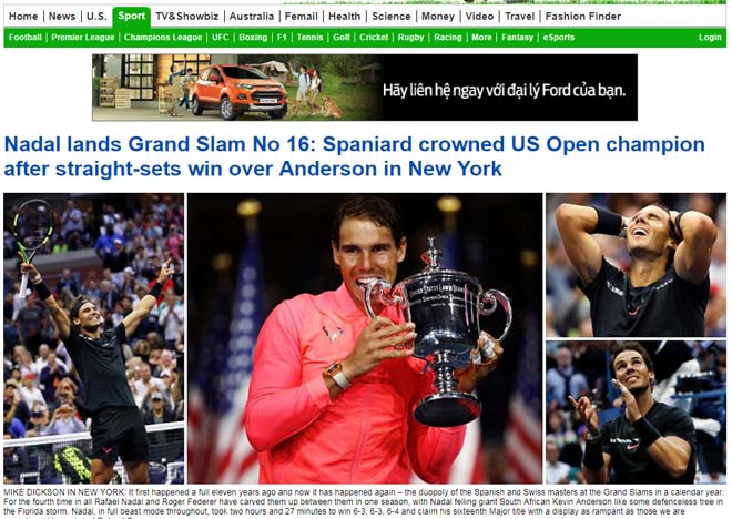 Tờ AS viết: “Một năm kinh ngạc của Nadal: 5 danh hiệu lớn và ngôi số 1 thế giới. Ở tuổi 31, tay vợt người Tây Ban Nha, đã có một năm 2017 như mơ. Anh đã giành Roland Garros và bây giờ là US Open, bên cạnh đó còn có chiến thắng ở Monte Carlo, Barcelona và Madrid. Nadal còn cơ hội tô đậm thêm một năm rực rỡ”.