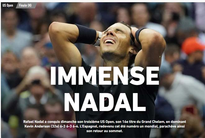 Tờ L’equipe (Pháp) giật tít đơn giản: “Nadal vĩ đại”, và bình luận: “Rafael Nadal đã bước vào trận chung kết US Open 2017 với Kevin Anderson bằng tâm trạng cực kì thoải mái và thực tế anh ấy đã thống trị cuộc chơi. Chiến thắng giúp tay vợt người Tây Ban Nha thu hẹp khoảng cách về Grand Slam với Roger Federer, khẳng định vị trí số 1 thế giới trên BXH ATP”.
