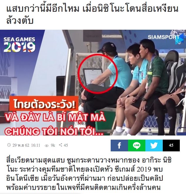 Trong bài viết, tờ báo này đã trích dẫn một video từ kênh truyền thông của Việt Nam (kênh mạng xã hội) và tố cáo kênh này có ý quay lén thông tin chiến thuật của U22 Thái Lan. Đoạn video này quay cảnh BHL của U22 Thái Lan đang ngồi trên cabin huấn luyện trong trận gặp U22 Indonesia vừa qua. Theo đó, hình ảnh chiến lược gia người Nhật Bản đang ngồi bên chiếc laptop được phóng to.