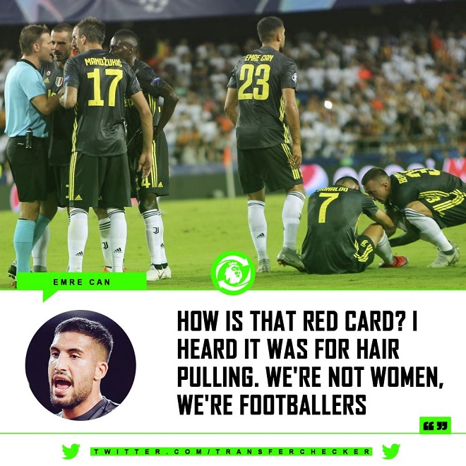 Ngay sau khi hình ảnh Ronaldo khóc lóc vì nhận chiếc thẻ đỏ trong trận đấu với CLB Valencia bị đem ra chế giễu, tiền vệ Emre Can của CLB Juventus đã lên tiếng bảo vệ đồng đội trên mạng xã hội. Cầu thủ người Đức chia sẻ: “Chúng tôi không phải đàn bà, chúng tôi đang chơi bóng đá”. Câu nói này ám chỉ Juventus luôn sẵn sàng đương đầu bất cứ khó khăn nào.