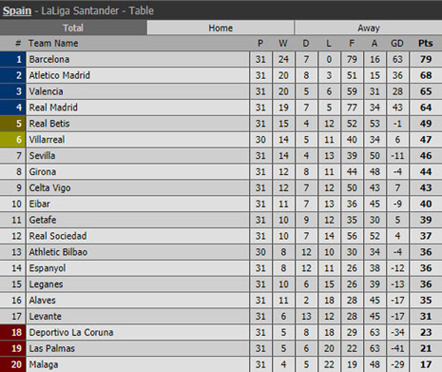 BXH La Liga sau các trận đã kết thúc ở vòng 31.