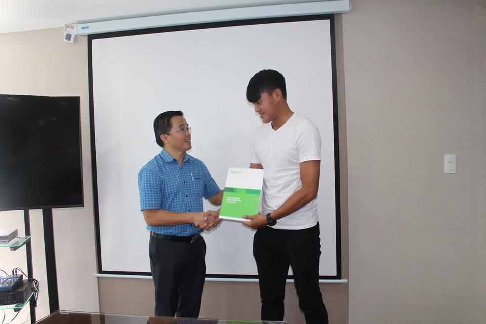 Trường đoàn Nguyễn Tấn Anh và trung vệ Phạm Hoàng Lâm trong ngày ký hợp đồng. Ảnh: T.A
