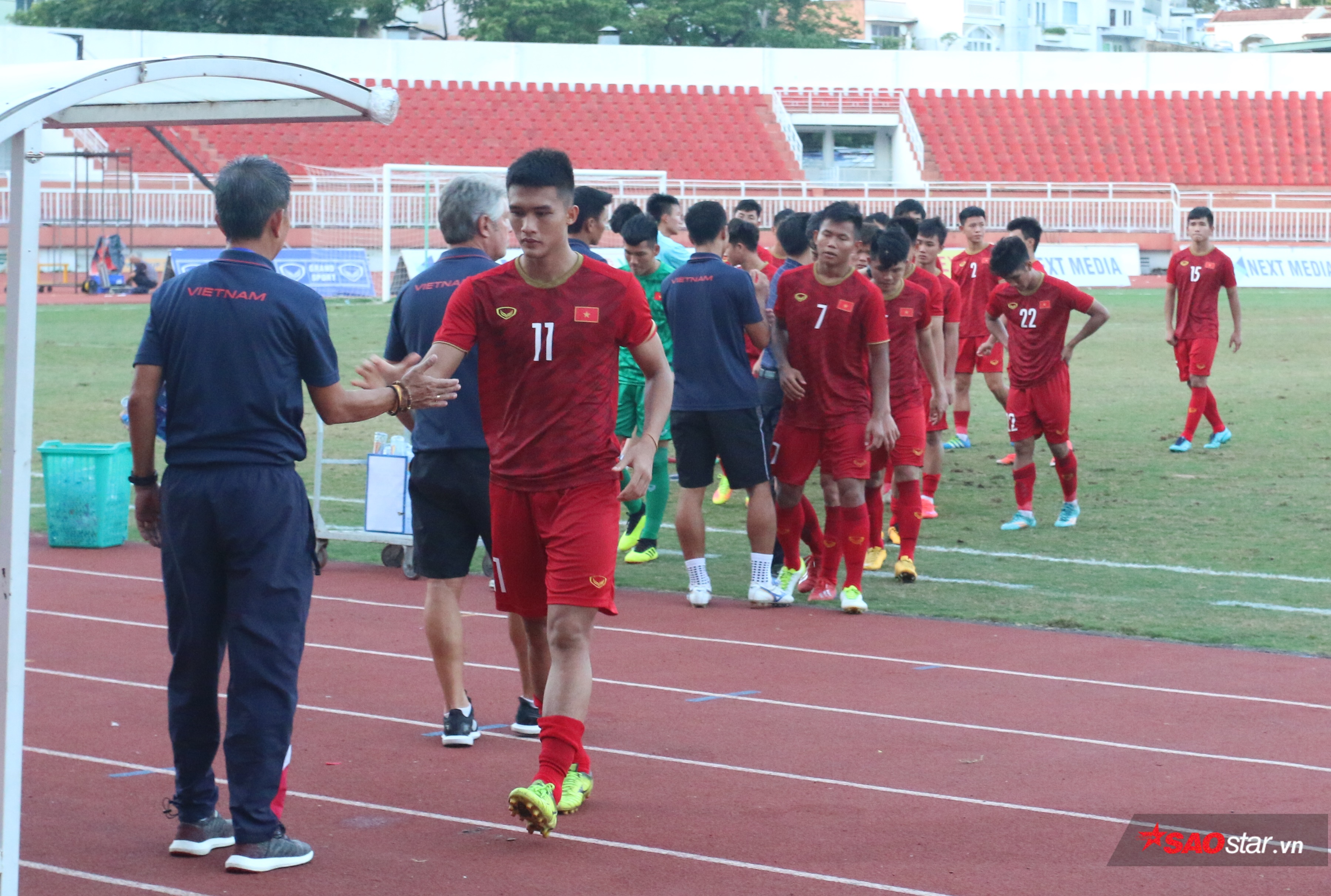 HLV Hoàng Anh Tuấn bắt tay các học trò sau trận U18 Việt Nam thua U18 Campuchia.