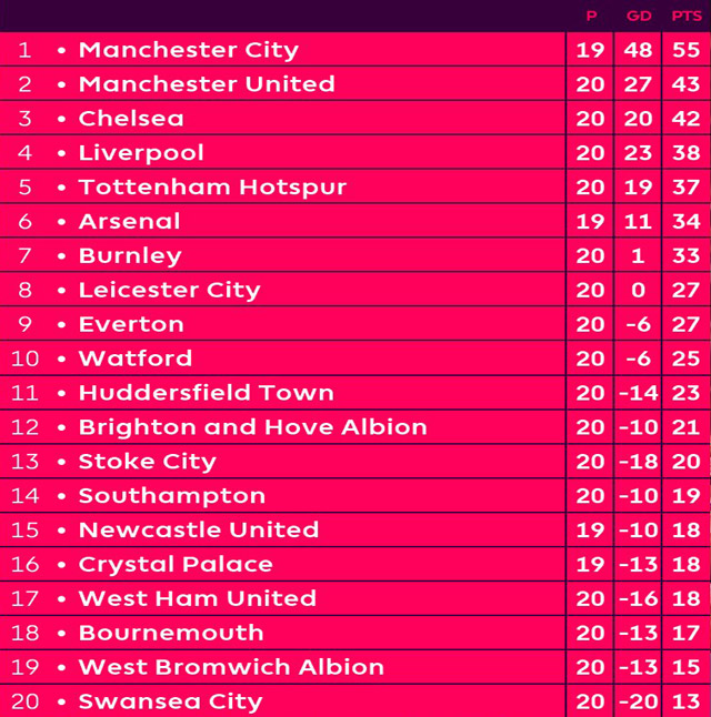 BXH Premier League sau các trận đã kết thúc tại vòng 20.