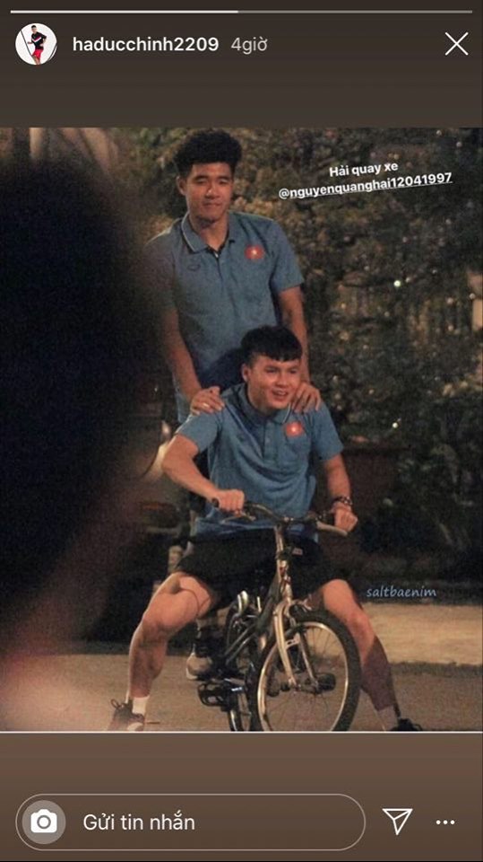 “Hải, quay xe”. Hà Đức Chinh troll đầy hóm hỉnh và không quên tag Quang Hải trên mạng xã hội. Đi kèm với dòng chữ đang trend là tấm ảnh Quang Hải chở Hà Đức Chinh bằng xe đạp.