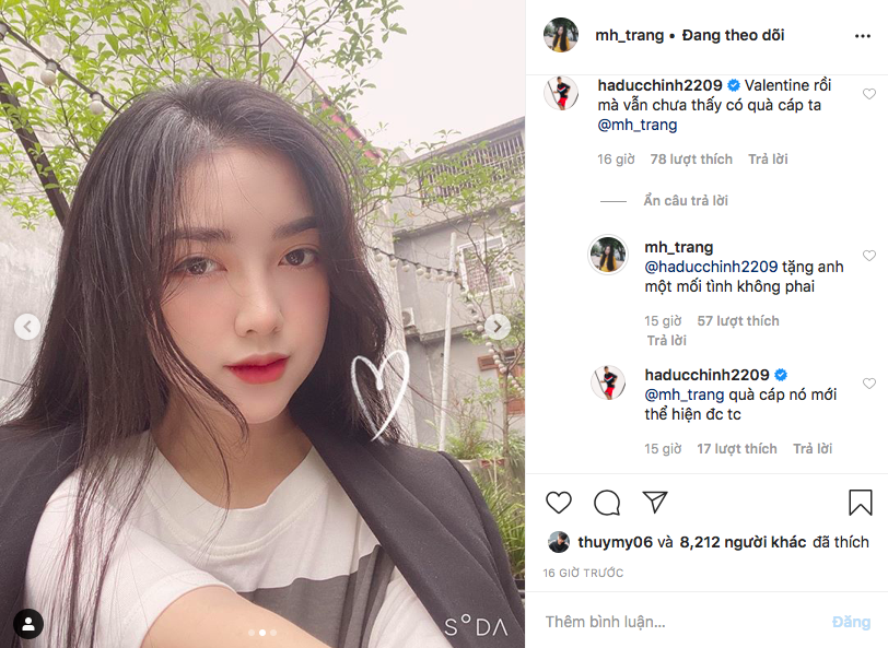 Thấy bạn gái hồn nhiên thả thính giữa mùa Valetine, dưới phần bình luận, Hà Đức Chinh liền nhắc nhở bạn gái chuyện tặng quà: “Valentine rồi mà vẫn chưa thấy có quà cáp ta”.