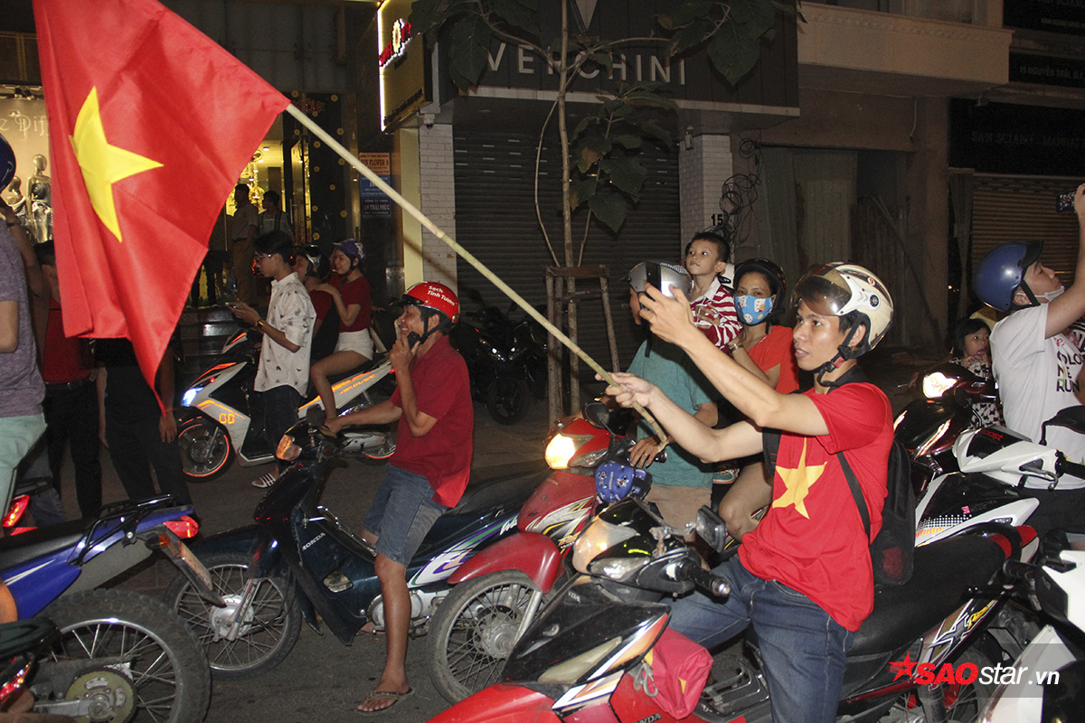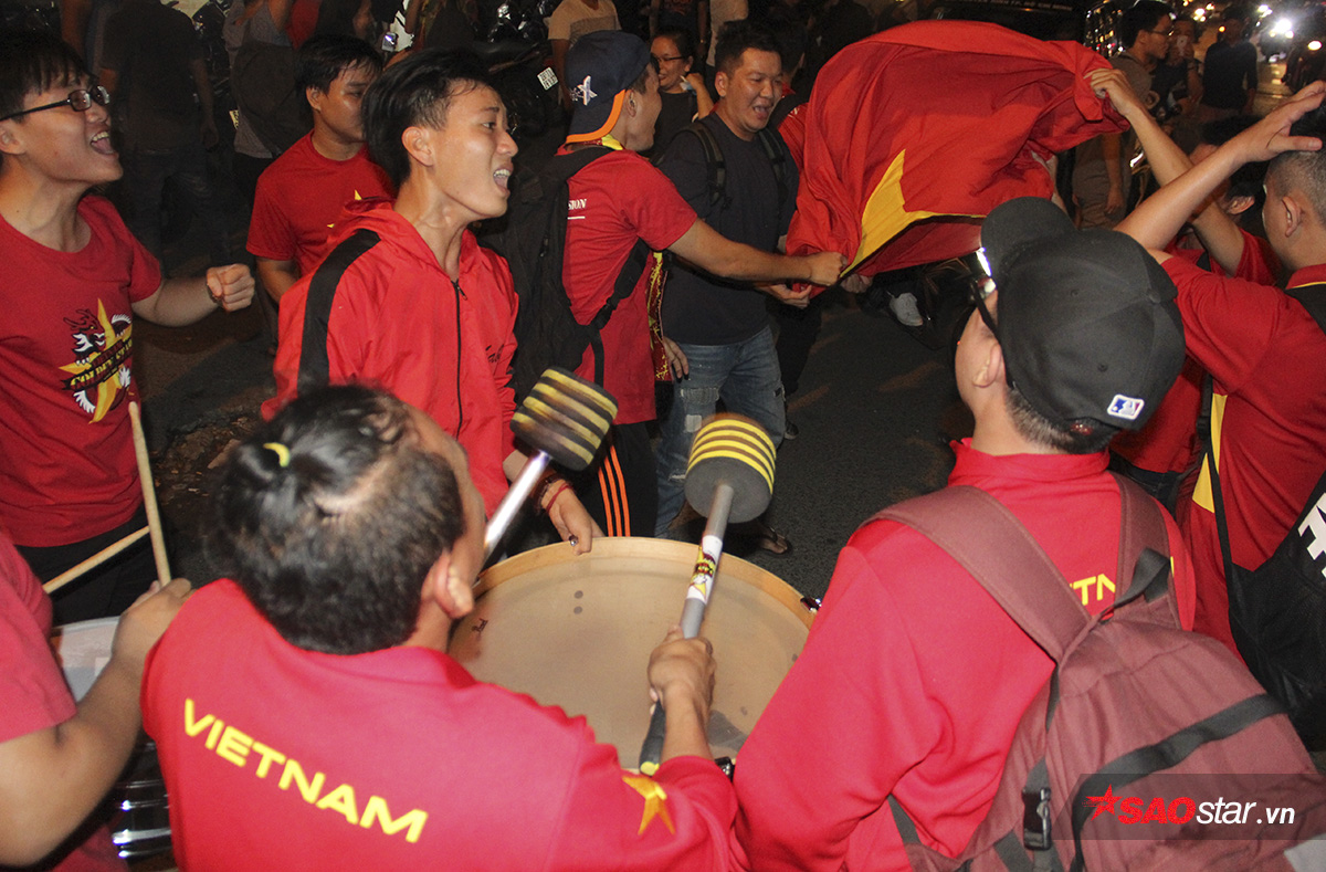 Dù đến nửa đêm, các tuyến đường vẫn sôi nổi như ngày hội với ngập tràn cờ, trống và sự hò hét của các fan bóng đá Việt.