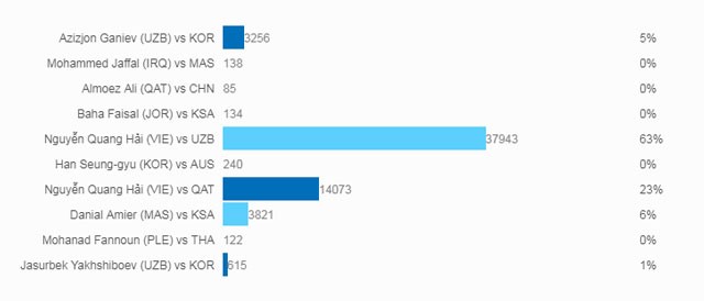 Hiện tại, đã có hơn 60.000 người đã bấm nút bầu chọn cho bàn thắng đẹp nhất giải U23 châu Á 2018. Trong đó, có 37.943 (63%) người chọn tuyệt phẩm đá phạt của Quang Hải trong trận gặp U23 Uzbekistan tại trận chung kết là bàn thắng đẹp nhất.