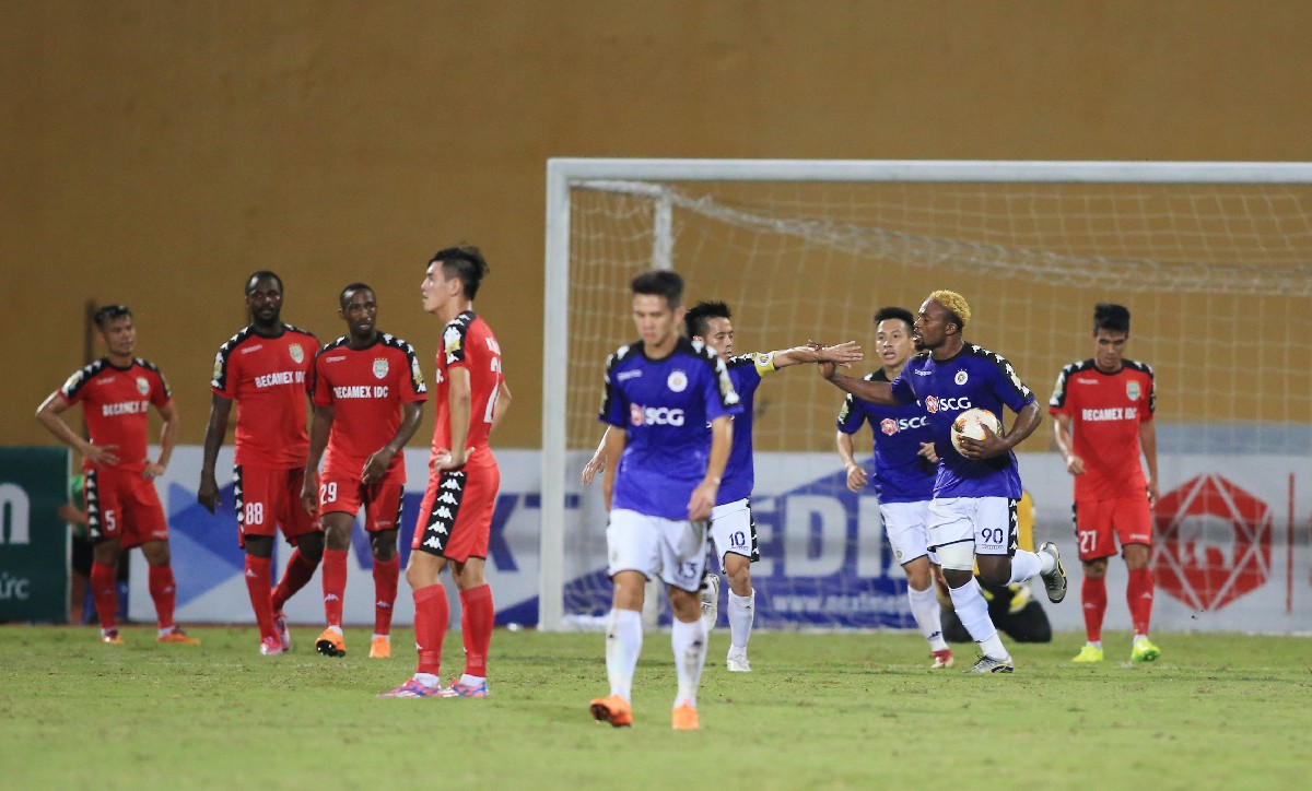 Bình Dương (áo đỏ) cho rằng VPF đang ưu ái CLB Hà Nội (áo xanh) trong việc xếp lịch đá bán kết Cúp quốc gia 2018. Ảnh: VPF