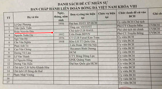 Trước đó, Tiểu ban Nhân sự VFF đã mắc sai sót nghiêm trọng khi để sót tên ông Đoàn Nguyên Đức - phó Chủ tịch tài chính VFF trong danh sách ứng viên nhiệm kỳ VIII do ông Ngô Văn Hỷ - Chủ tịch CLB futsal Kim Toàn giới thiệu bầu Đức.
