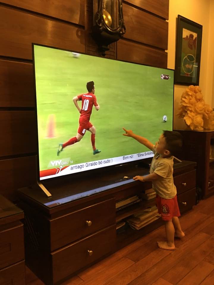 Văn Quân - con trai Văn Quyết dõi theo người bố chơi bóng qua tivi. Ảnh: NVCC