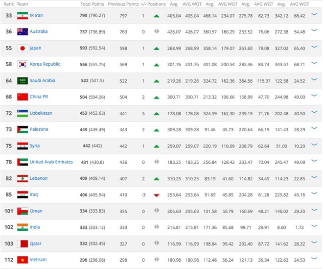 Tại khu vực châu Á, top 5 vẫn thuộc về những cái tên quen thuộc là Iran, Australia, Nhật Bản, Hàn Quốc và Saudi Arabia. Đây chính là 5 đại diện của châu Á tham dự World Cup 2018.