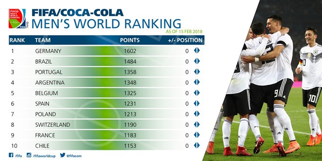 Trên bình diện thế giới, trong khoảng thời gian giữa tháng 1 cho đến giữa tháng hai chỉ có 34 trận đấu giao hữu nên top 10 không có sự thay đổi, đứng đầu vẫn là tuyển Đức. Iceland leo 2 bậc lên vị trí 18, xếp hạng cao nhất trong lịch sử bóng đá nước này.