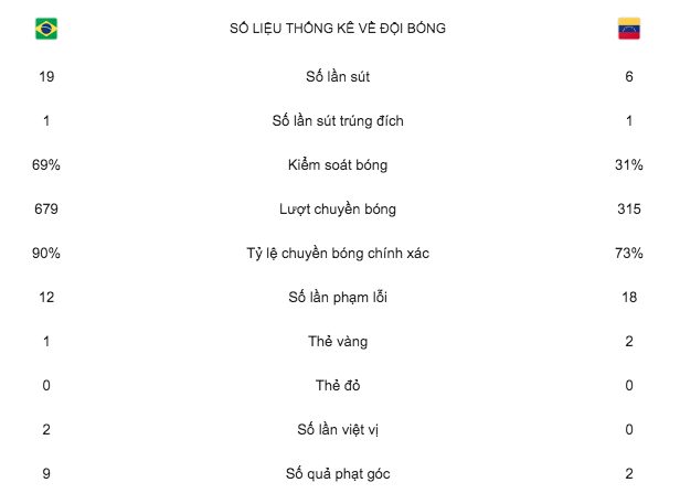 Cơ hội liên tục đến với Brazil trong hiệp 1, nhưng từ Neres, Firmino hay kể cả Gabriel Jesus đều không một lần đưa được bóng vào lưới Venezuela. Cơ hội rõ ràng nhất bên phía đội bóng áo vàng trong hiệp đầu tiên có lẽ là tình huống Firmino xoay người dứt điểm tung lưới Venezuela nhưng trọng tài xác định cầu thủ của Liverpool đã phạm lỗi trước đó.