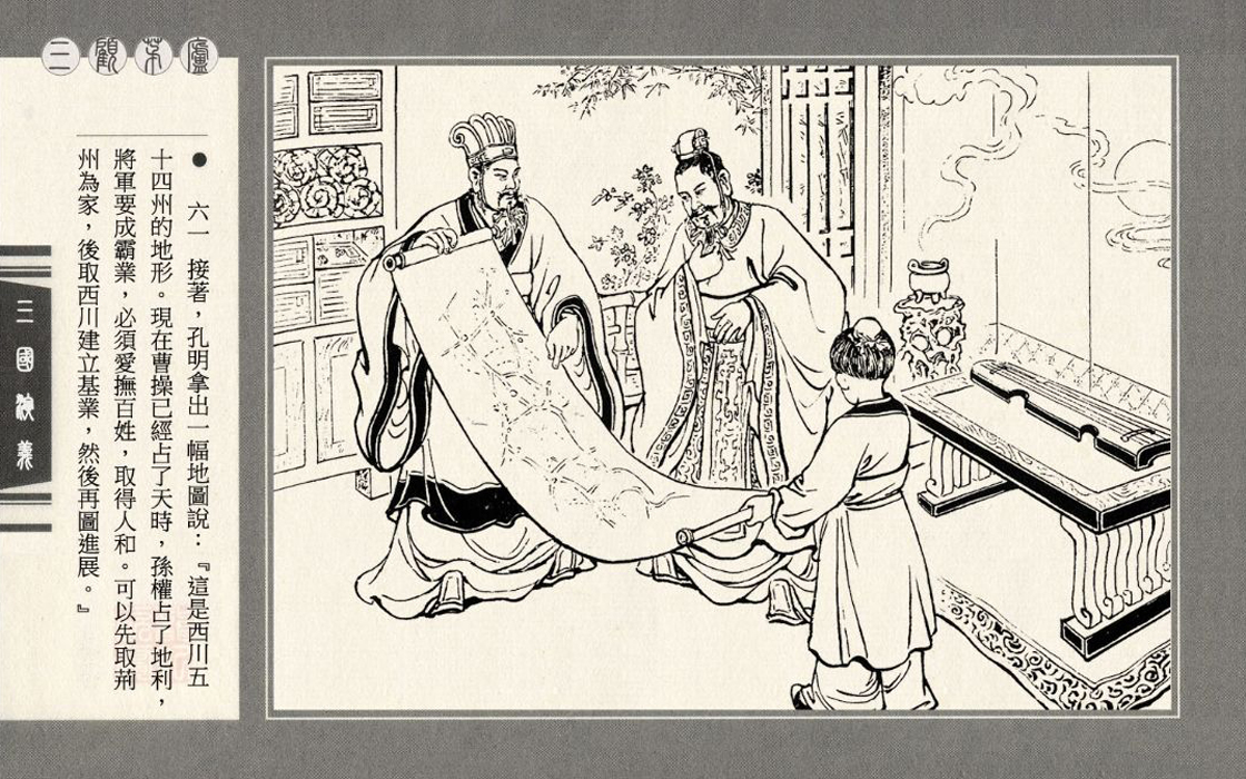 Vậy là bất chấp khí trời khắc nghiệt (tuyết rơi ngập đường núi), Lưu Bị kéo theo 2 ông em không ngớt lời kêu ca là Quan Vũ và Trương Phi đến nhà tranh thỉnh Gia Cát Khổng Minh ra giúp phục hưng Hán thất. Không chịu nổi thịnh tình 3 lần đến viếng của Lưu Huyền Đức, Khổng Minh rốt cuộc phải nhận lời và định ra thế chân vạc từ lều cỏ.