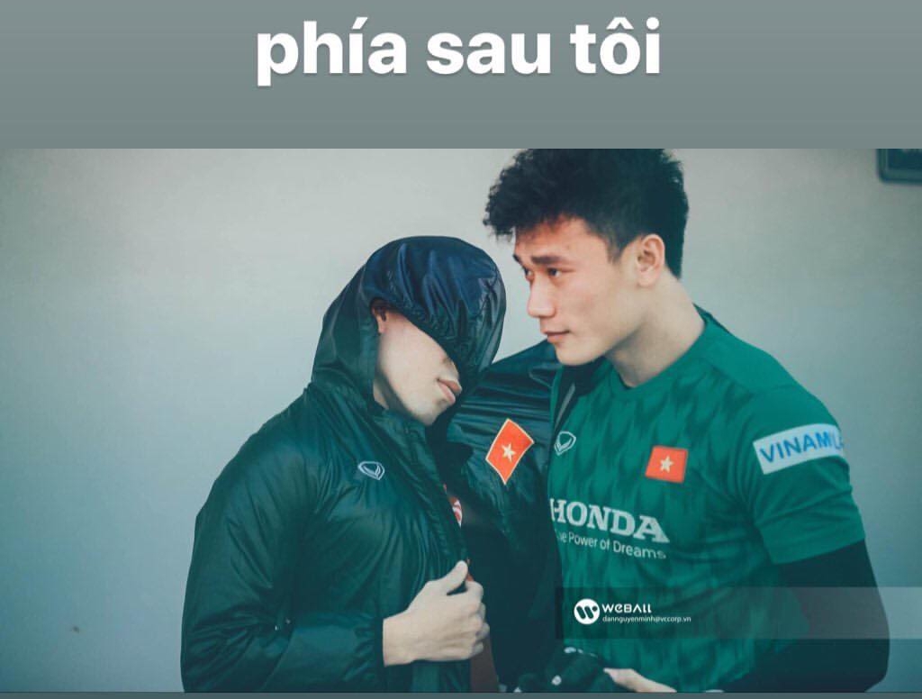Mới đây trên trang cá nhân, thủ môn Bùi Tiến Dũng khiến cư dân mạng phì cười khi chia sẻ bức ảnh ghép Đình Trọng ốm ấp, tựa vào vai mình với biểu cảm vô cùng khó đỡ. Thủ môn người Thanh Hóa còn hóm hỉnh viết: “Phía sau tôi”.