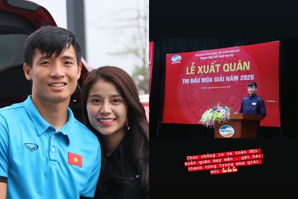Trong ngày xuất quân của chồng, Khánh Linh đã gửi lời chúc tới Tiến Dũng và toàn đội : “Chúc chồng yêu và toàn đội xuất quân may mắn, gặt hái thành công trong mùa giải mới” kèm theo hình Chàng cầu thủ vình dự đứng trên bục phát biểu trước CLB.