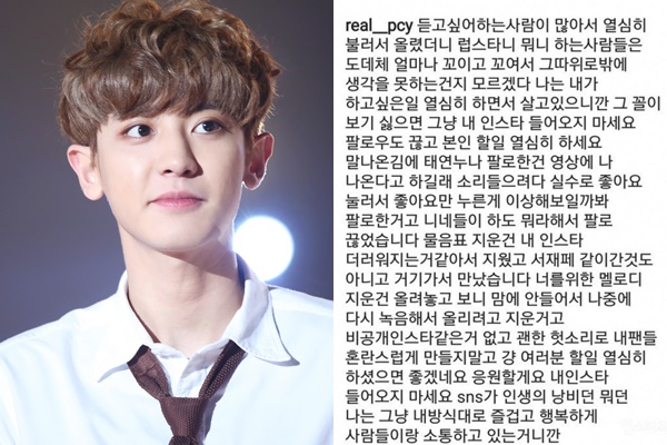 Chan Yeol từng viết “tâm thư” để đáp trả những tin đồn về chuyện anh và Tae Yeon hẹn hò. Thành viên EXO viết rằng: “Tôi chỉ sống và làm những gì tôi muốn làm. Nếu bạn không thích thì đừng truy cập Instagram của tôi. Hãy dừng follow tôi và tập trung vào công việc của mình đi”.