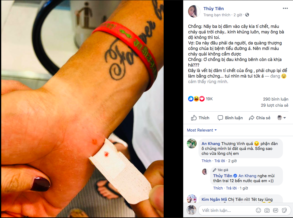 Mới đây nhất, Thủy Tiên vừa chia sẻ màn đối thoại giữa cô và ông xã Công Vinh khiến người hâm mộ thích thú. Đầu đuôi câu chuyện bắt nguồn từ việc Công Vinh thông báo với vợ rằng anh bị chảy rất nhiều máu vì vô tình đâm vào cây. Thậm chí để tăng tính thuyết phục, cựu tiền đạo còn dán hẳn băng keo cá nhân.