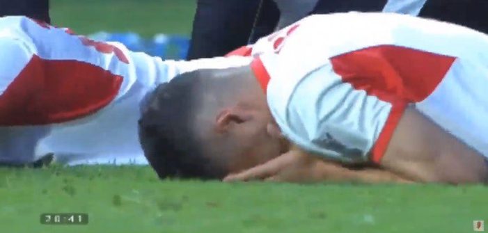 Cầu thủ ĐT Jordan nằm gục xuống sân khóc nức nở. Họ đã phải dừng bước tại vòng 1/8.