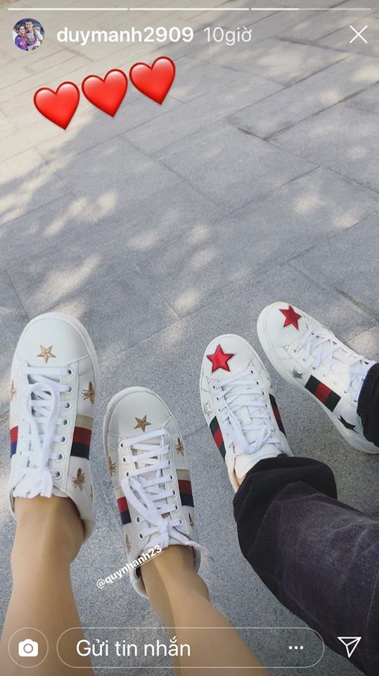 Khác với những người đồng đội, Duy Mạnh “khoe” bạn gái khéo léo hơn. Trung vệ này chỉ đăng một tấm ảnh mang giày đôi cùng bạn gái trên story instagram.