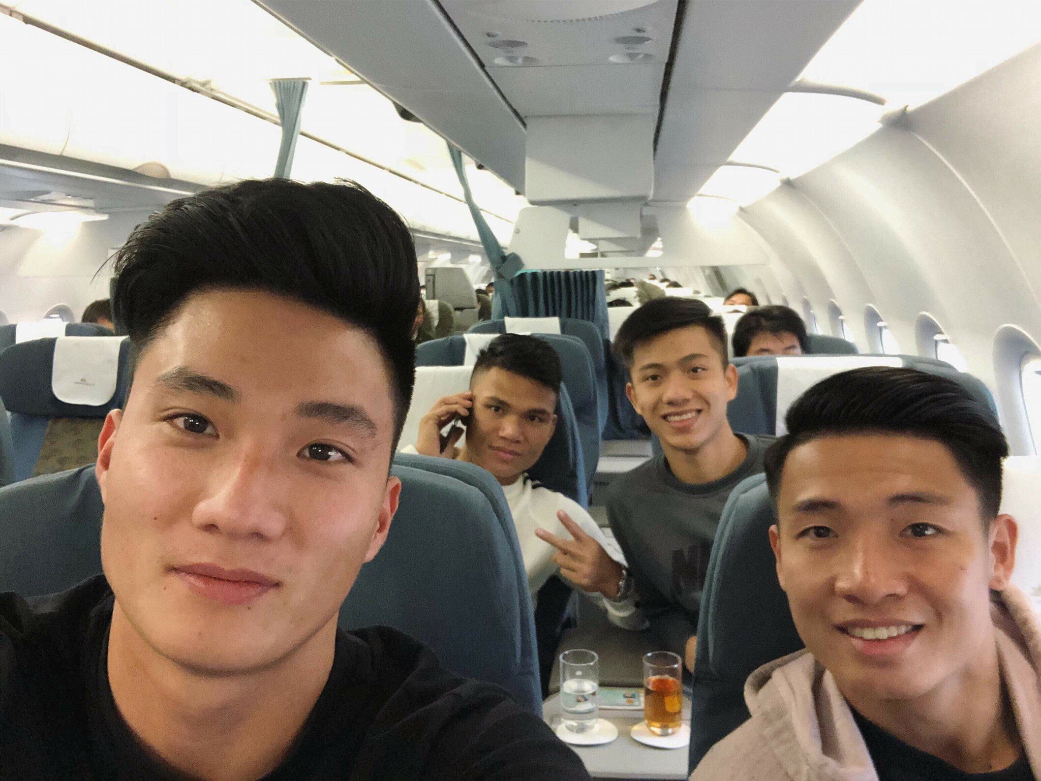 Hậu vệ Bùi Tiến Dũng, Phan Văn Đức, thủ môn Nguyễn Văn Hoàng, Xuân Mạnh trên chuyến bay vào TP.HCM ngày 2/2.