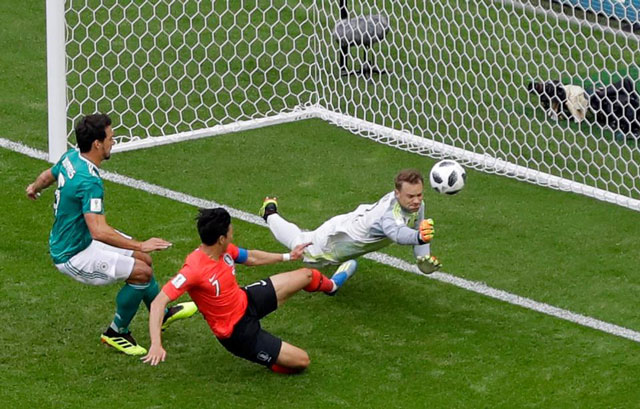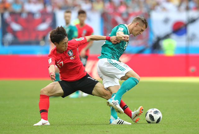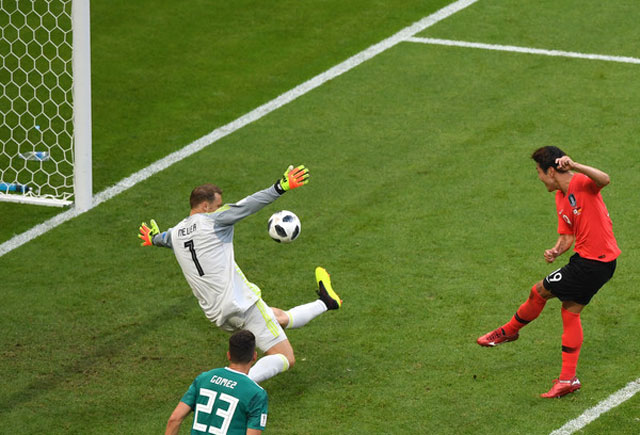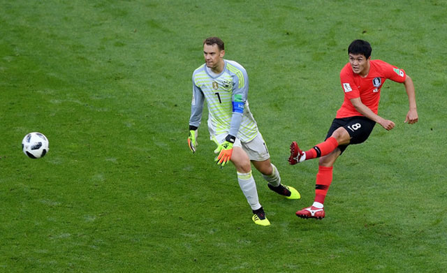 Ju Se-jong cướp được bóng trong chân của thủ môn Manuel Neuer trước khi kiến tạo cơ hội cho Son Heung-Min. Ảnh: Getty.
