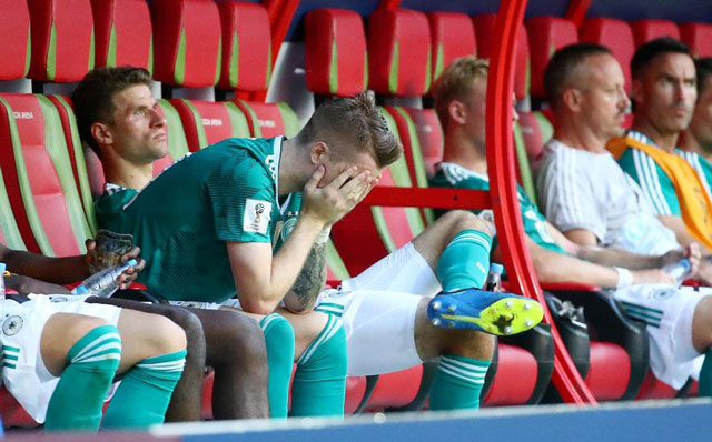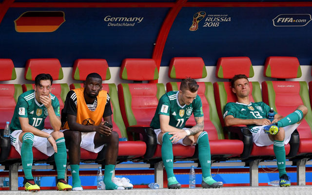 Các tuyển thủ Đức “chết lặng” trên ghế dự bị. Ảnh: Getty.