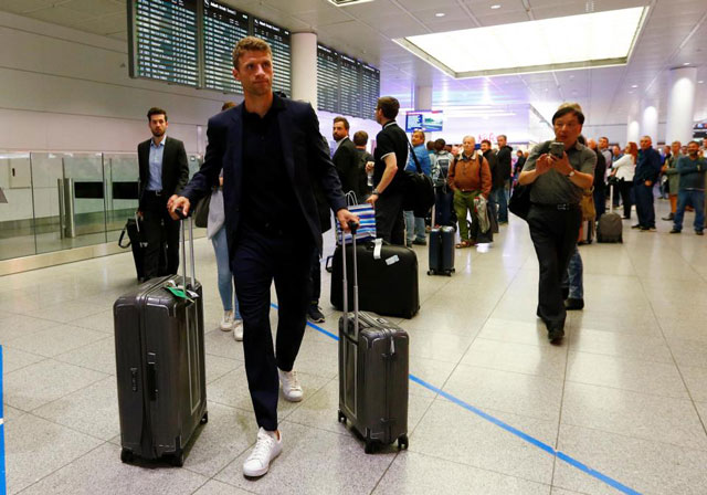 Các cầu thủ Đức mặc áo đen khi về nước trông cực kỳ sầu thảm.