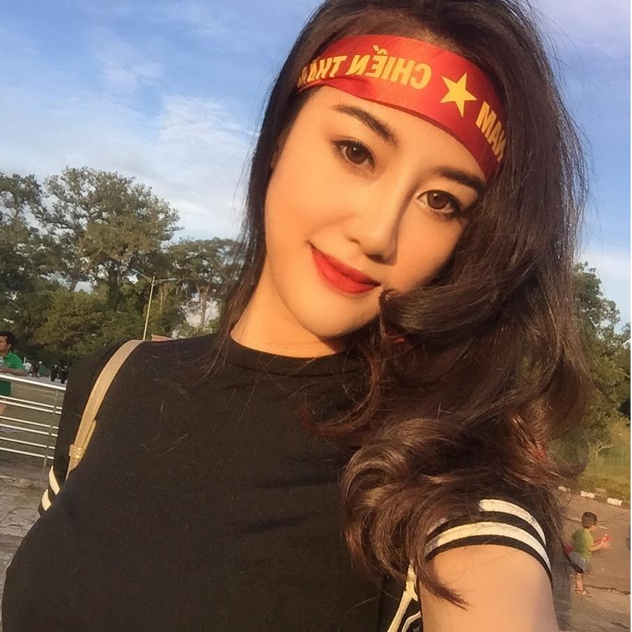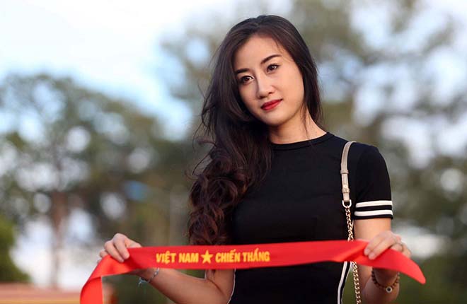 Biết tin Việt Nam thi đấu trên đất nước của những chú voi rừng. Cô gái gốc Hà Thành này đến xem và cổ vũ rất nhiêt tình để đội tuyển Việt Nam giành chiến thắng 3-0 trước tuyển Lào.