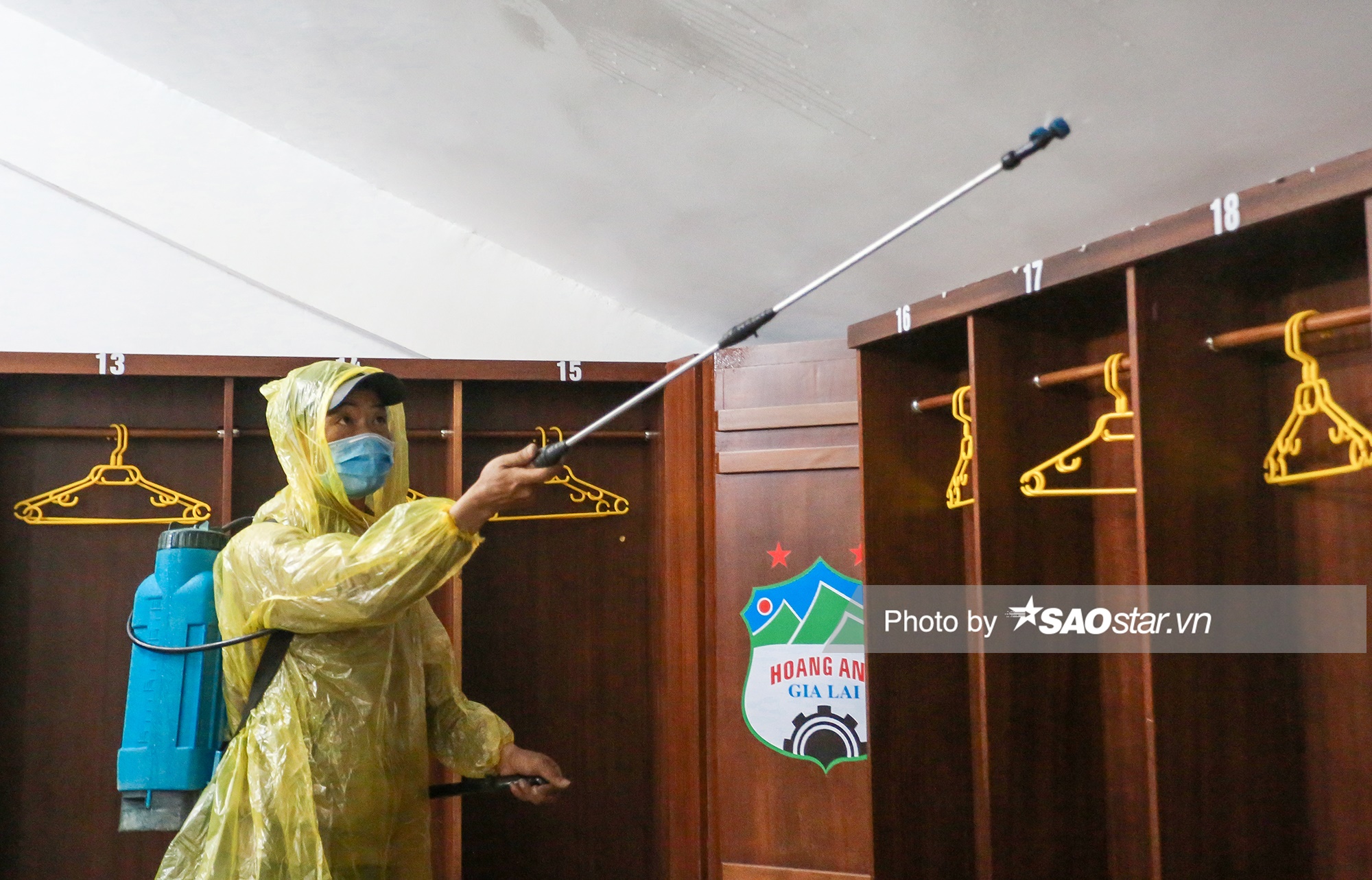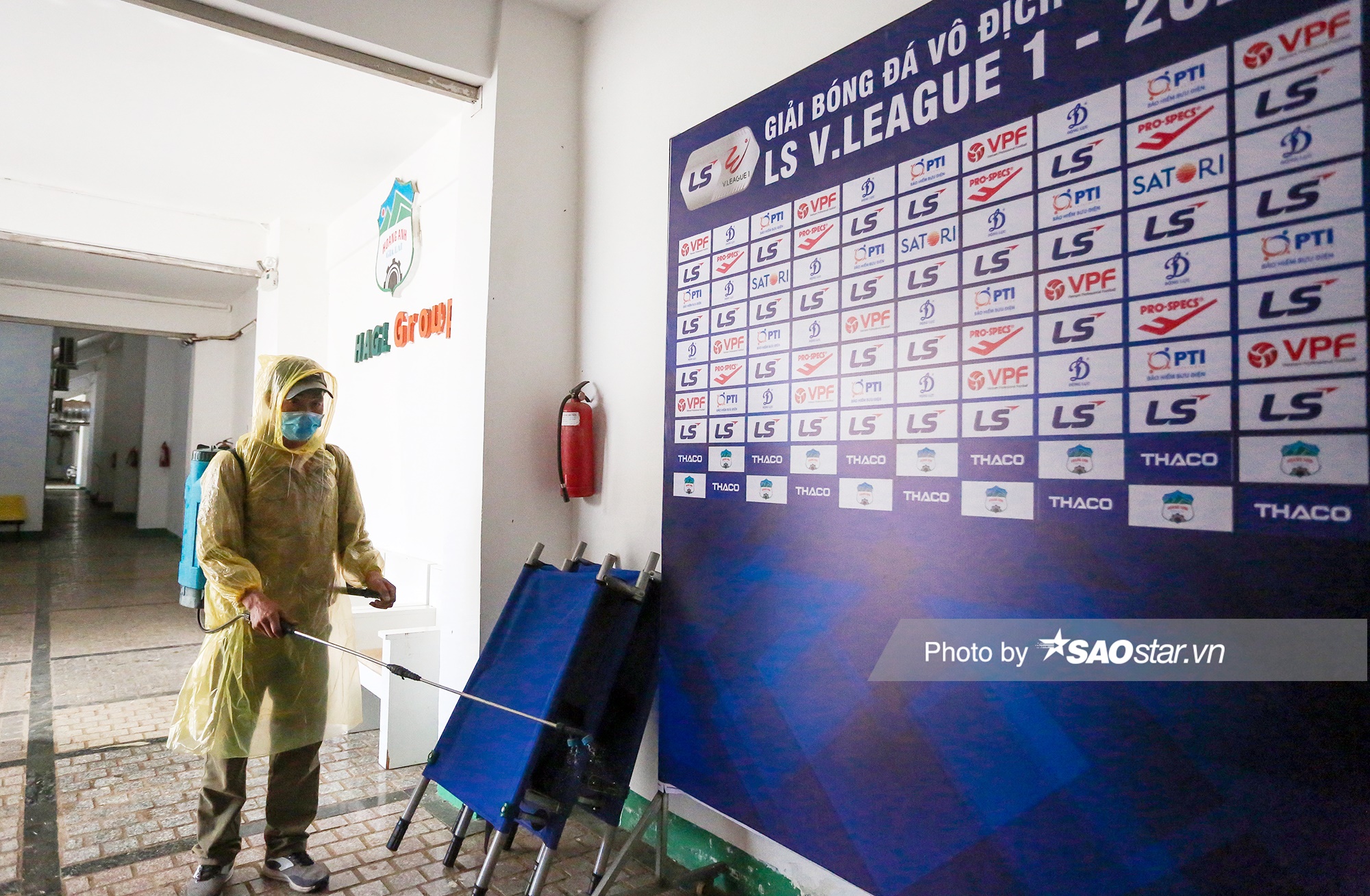 Nhân viên xịt khư trùng ở khu ban huấn luyện ở trận HAGL - Quảng Ninh.