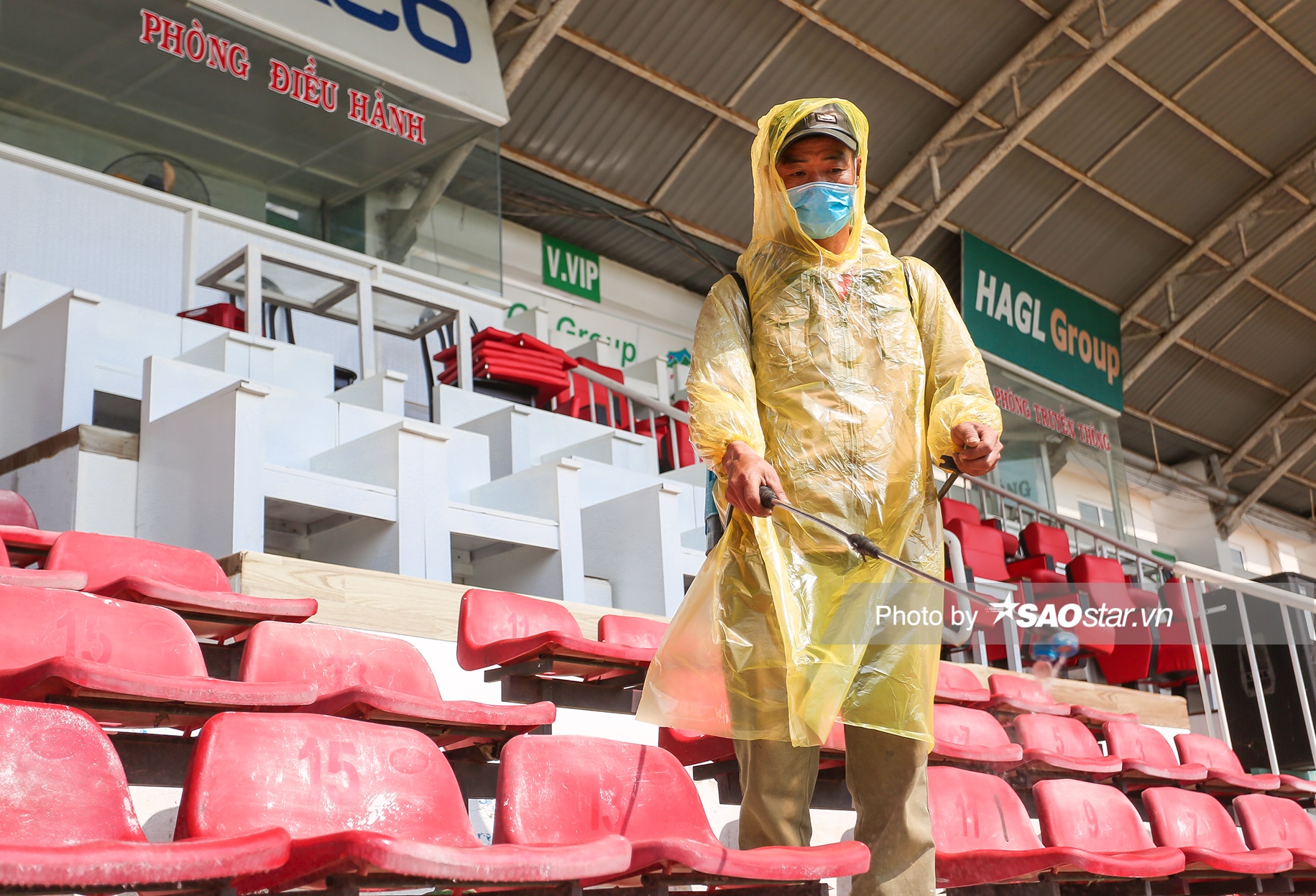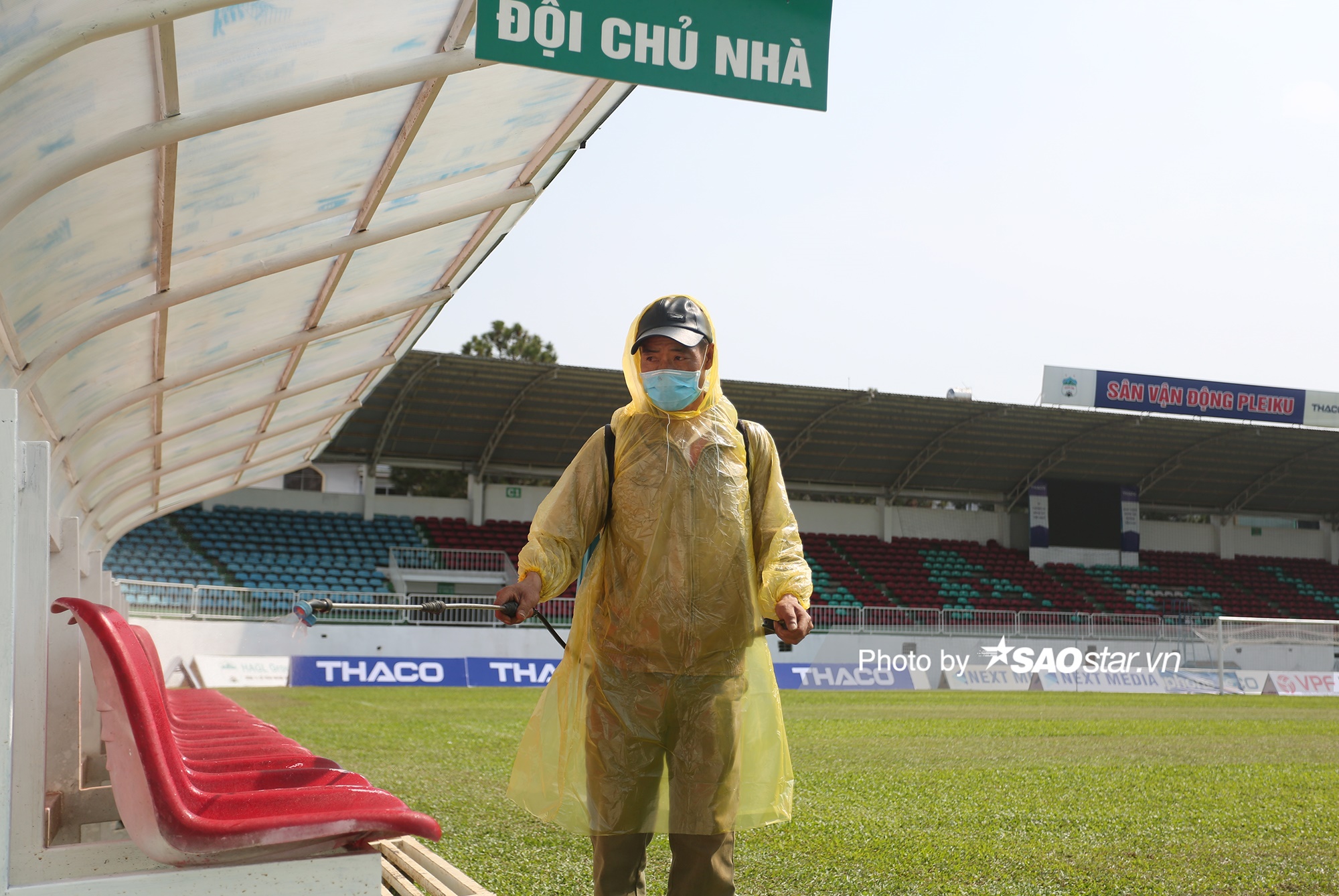 Khu vực phía bên trong sân vận động Pleiku cũng được xịt khử trùng.