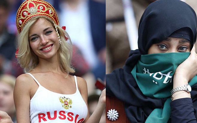 Sự khác biệt rõ rệt giữa nữ cổ động viên Nga và Saudi Arabia.