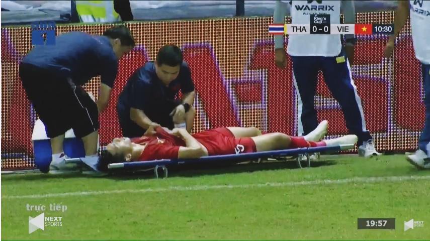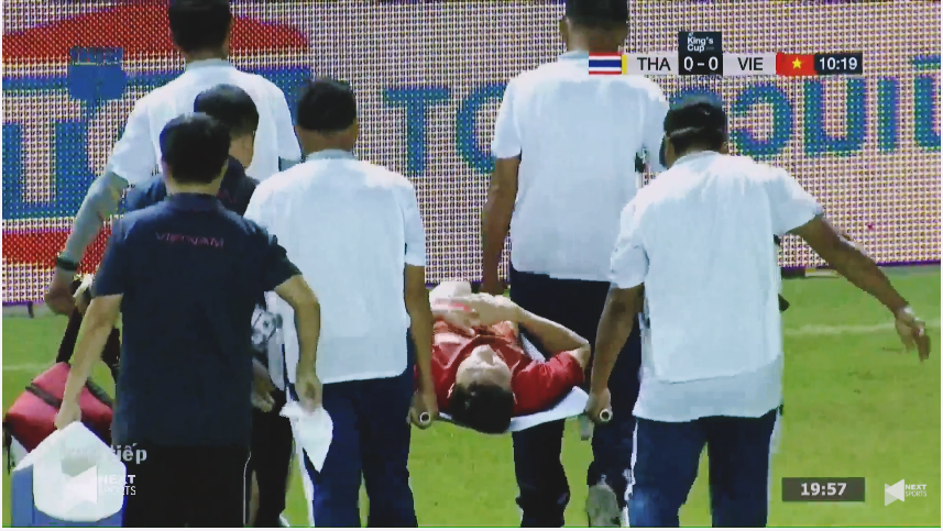 Trọng tài buộc phải cho trận đấu tạm dừng trong ít phút. Rất may sau khi được bác sĩ chăm sóc, hậu vệ của CLB Hà Nội có thể trở lại thi đấu. Trận đấu đang diễn ra vô cùng hấp dẫn với những tình huống ăn miếng trả miếng từ phái Việt Nam và Thái Lan.