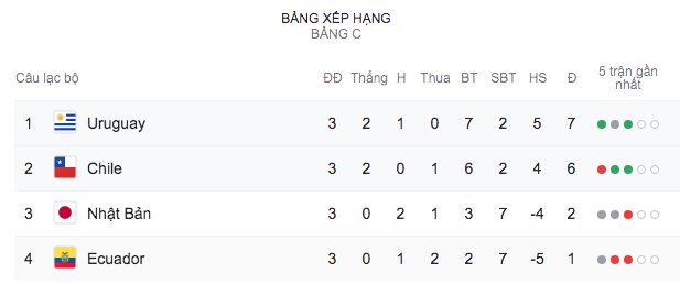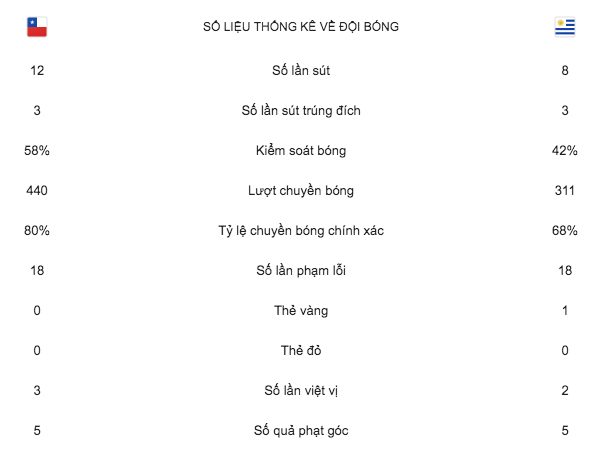 Quãng thời gian còn lại là không đủ để Chile lật ngược thế cờ. Thua 0-1, Alexis Sanchez cùng đồng đội để mất ngôi đầu bảng và sẽ phải đối mặt ứng viên vô địch Colombia ở tứ kết. Trong khi đó, cánh cửa vào bán kết của Uruguay mở rộng hơn khi thầy trò HLV Tabarez chỉ phải đối đầu Peru.