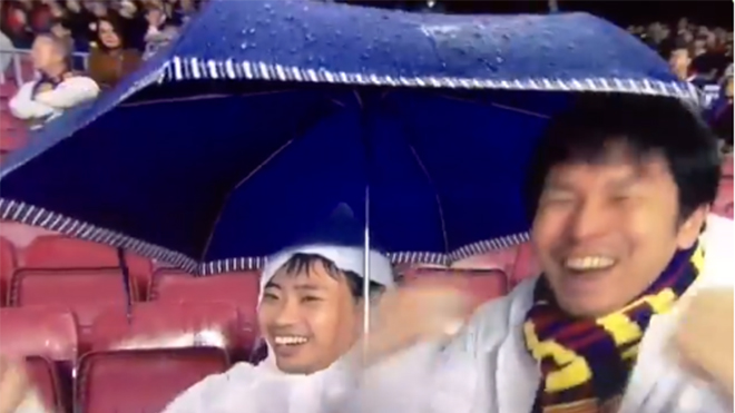 Tuy nhiên, điều điên rồ nhất trong tình huống này lại là cảnh 2 CĐV được cho là người Trung Quốc của Barcelona đã tỏ ra phấn khích tột độ! Có lẽ là do họ thấy bóng vào lưới nên nghĩ rằng đội nhà ghi bàn, cho dù trọng tài đã đưa ra tấm thẻ đỏ và vẻ mặt của Pique buồn như đưa đám.