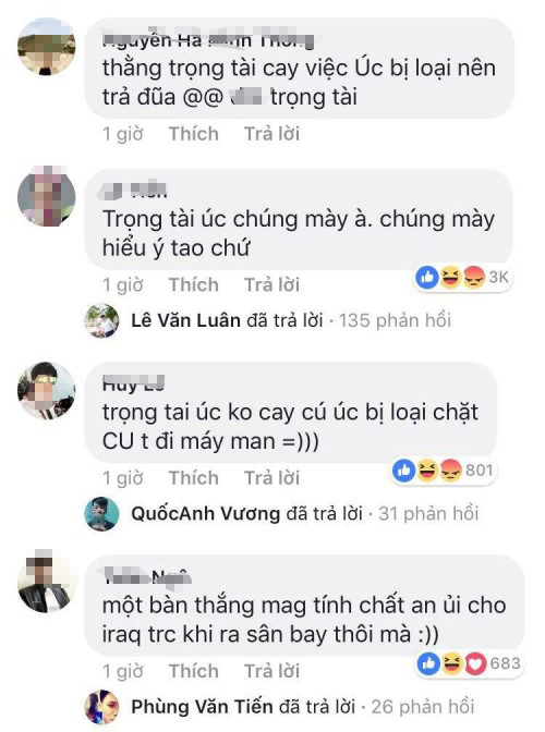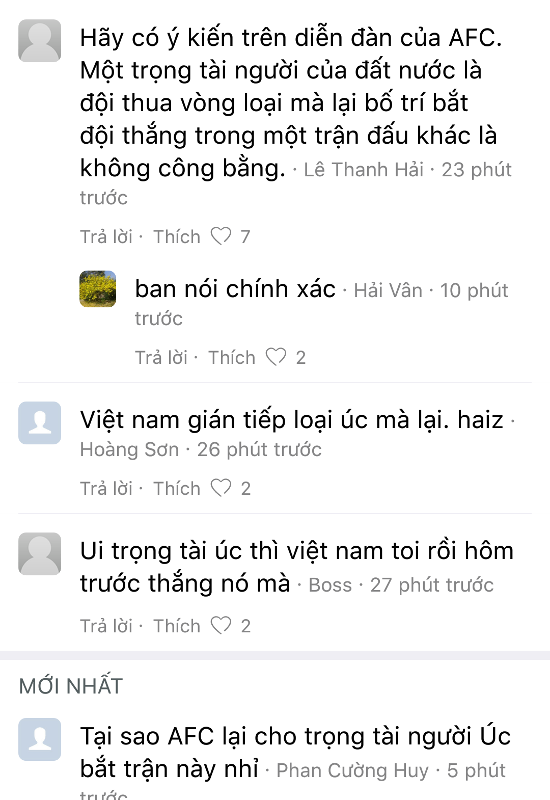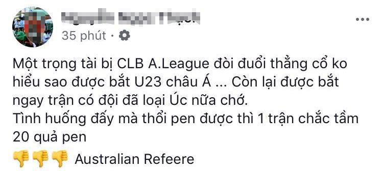 Nick-name có tên Nguyễn Ngọc T. bức xúc chia sẻ: “Một trọng tài đã bị A.League đòi đuổi thẳng cổ không hiểu sao được bắt U23 châu Á. Còn lại được bắt ngay trận có đội đã loại Úc nữa chớ. Tính huống đấy mà thổi 11 mét được thì 1 trận chắc tầm 20 quả pen”.