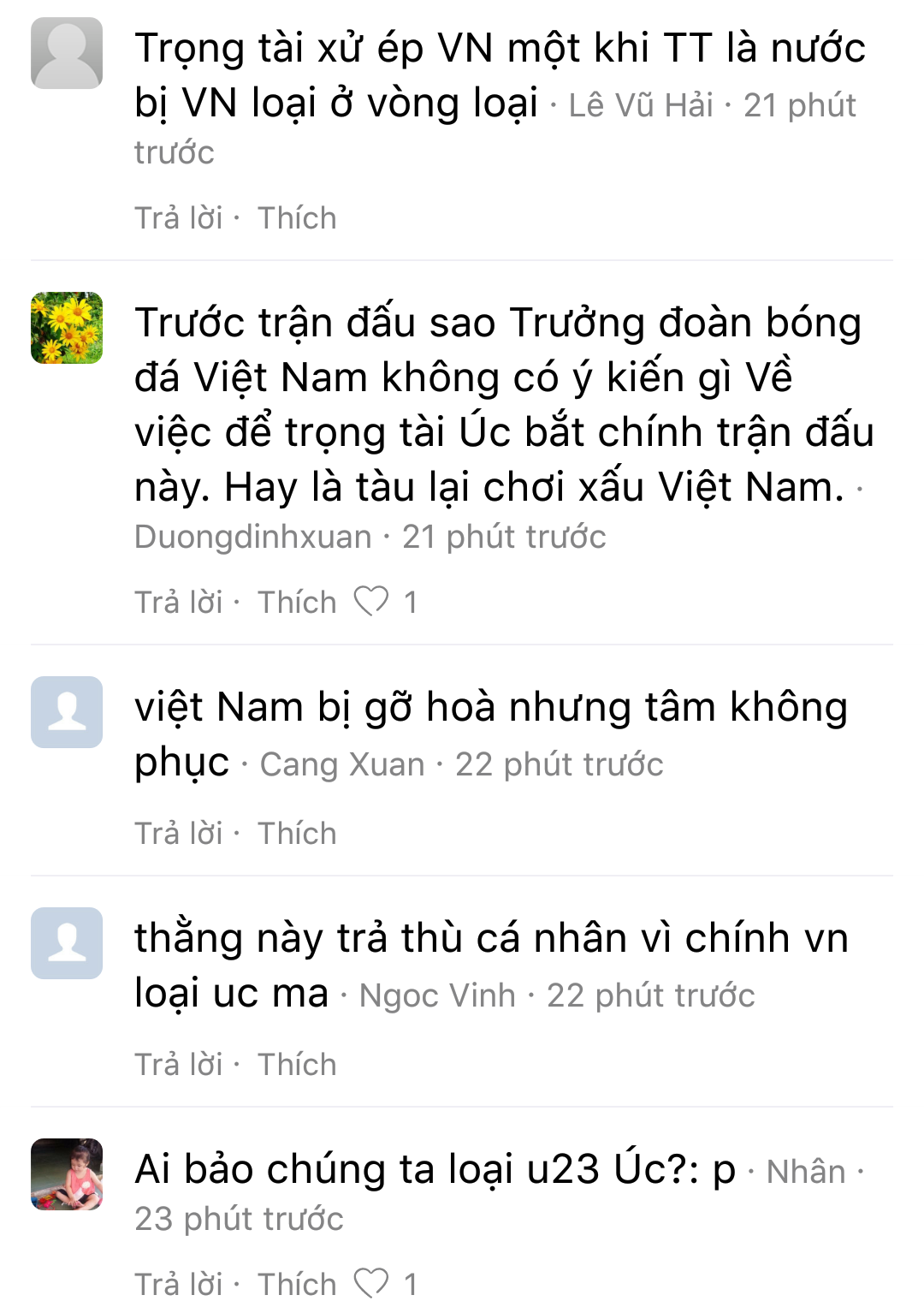 Trên các diễn đàn bóng đá Việt, người hâm mộ liên tục chỉ trích trọng tài chính. Trong đó, một diễn đàn đặt câu hỏi: “Vì sao U23 Việt Nam bị thổi 11 mét?”. Câu trả lời được nhiều người đồng tình nhất chính là vì U23 Việt Nam đã loại U23 Úc.