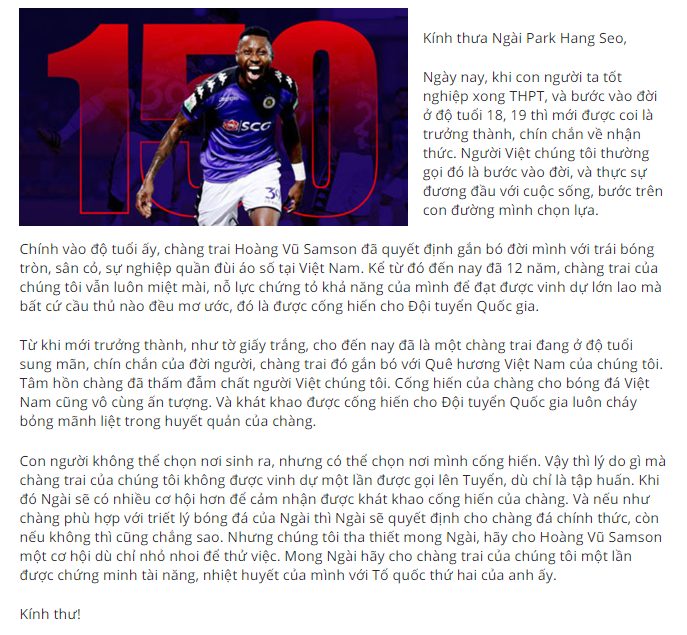 Vậy thì lý do gì mà chàng trai của chúng tôi không được vinh dự một lần được gọi lên Tuyển, dù chỉ là tập huấn. Khi đó Ngài sẽ có nhiều cơ hội hơn để cảm nhận được khát khao cống hiến của chàng. Và nếu như chàng phù hợp với triết lý bóng đá của Ngài thì Ngài sẽ quyết định cho chàng đá chính thức, còn nếu không thì cũng chẳng sao. Nhưng chúng tôi tha thiết mong Ngài, hãy cho Hoàng Vũ Samson một cơ hội dù chỉ nhỏ nhoi để thử việc. Mong Ngài hãy cho chàng trai của chúng tôi một lần được chứng minh tài năng, nhiệt huyết của mình với Tổ quốc thứ hai của anh ấy.”