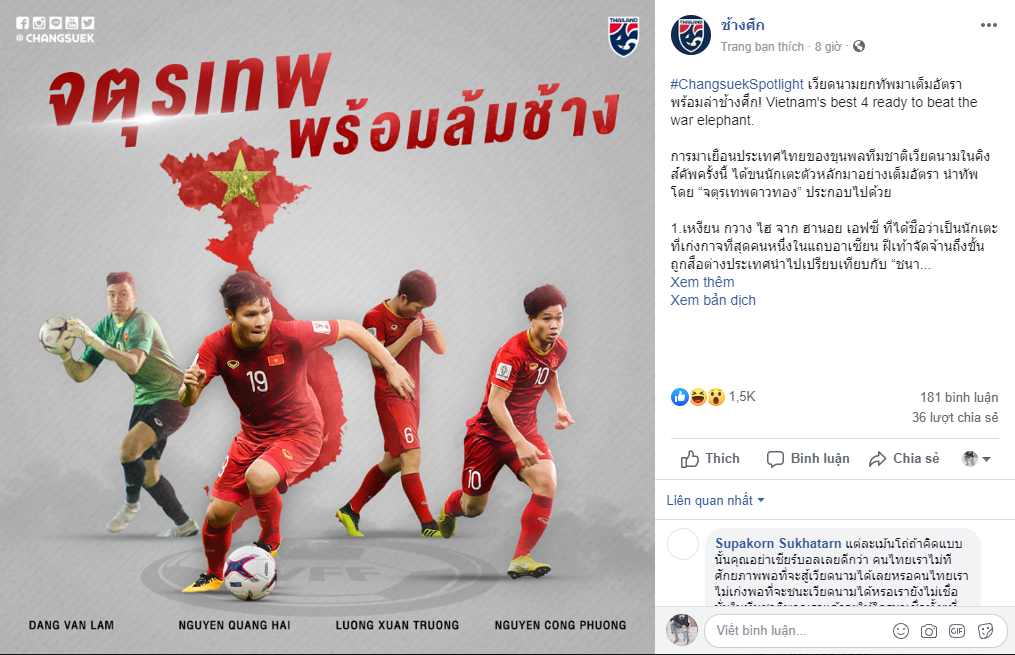 Truyền thông cũng như người hâm mộ của cả hai nước đang đổ dồn sự tập trung với mọi thông tin liên quan về trận cầu này. Mới đây, trên một fanpage lớn của CĐV Thái Lan đã có những đánh giá sơ bộ về sức mạnh của ĐT Việt Nam đồng thời chỉ ra 4 cái tên nguy hiểm nhất HLV Sirisak Yodyardthai và các học trò cần phải hết sức dè chừng.