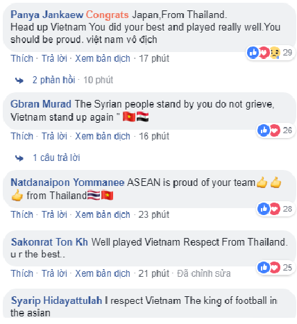 Tài khoản khác có tên Chotiros Saengsrinual chia sẻ: “Tôi rất buồn vì đại diện cuối cùng của ĐNA cũng đã bị loại. Nhưng, tôi tự hào vì các bạn, Việt Nam. Nhật Bản đã rất may mắn mới có thể đánh bại được các bạn. Hãy nghỉ ngơi và chuẩn bị cho một tương lai xa hơn”.